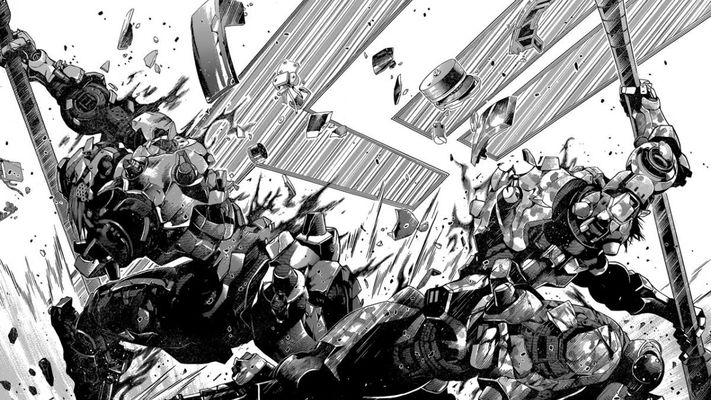 As a raw recruit, he has no skills, so he begs Sergeant Ferrell to help train him, both physically and with the weapons systems he’ll be using. He learns to break down every second so that he always sees what’s coming and knows how to respond. However, he keeps running up against the weapons’ limitations. They only have a certain number of rounds; he needs a weapon that will allow him to kill as many Mimics as possible on the battlefield without stopping to reload. He goes to see Shasta Raylle, the weapons designer who made Rita’s distinctive red jacket and the 200 kg battle axe that has allowed her to take the field by force. “It took something massive to shatter a Mimic endoskeleton in one hit,” Keiji observes. “That it could kill me in the process was beside the point.”